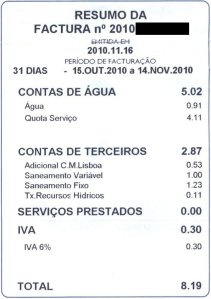 Na factura da EPAL de Novembro passado é referido que o custo da água consumida foi de 91 cêntimos, no entanto o valor final da factura foi de 8.19 EUROS, ou seja, em taxas, quotas de serviço, pagamento para saneamento e impostos paguei neste mês exactamente 900% do valor do bem consumido.
